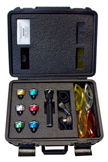 多波段警用檢查光源配有結(jié)實(shí)的黑色陽(yáng)化鋁手電殼體、七個(gè)可快速更換的LED燈頭(UV-A(長(zhǎng)波紫外)、藍(lán)光、藍(lán)綠光、綠光、琥珀光及白光)、三個(gè)插入式濾色板(黃色、橙色及紅色)、交流及直流充電器、四個(gè)眼鏡(紫外防護(hù)、橙色、黃色及紅色眼鏡)及一個(gè)手提箱。