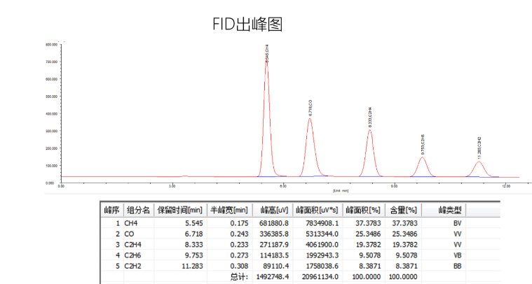 以氬氣為載氣前裝置六通閥進(jìn)樣經(jīng)色譜儀六通閥相連的預(yù)處理柱進(jìn)行分離,在氫氣,氧氣,氮?dú)猓淄,一氧化碳進(jìn)入5A分子篩柱而CO2未出預(yù)處理柱前六通閥反吹出的二氧化碳及碳、乙烯、丙烷等進(jìn)入FID2充檢測(cè)柱,由FID2測(cè)器檢出碳二碳三烴烷類,而經(jīng)5A柱分離的氫氣,氧氣,氮?dú),甲烷,一氧化碳進(jìn)入TCD檢測(cè)器,檢出氫氣,氧氣,氮?dú);樣品氣再?jīng)轉(zhuǎn)化爐進(jìn)FID檢出甲烷,一氧化碳。另一路經(jīng)RB-WAX毛細(xì)FID1檢出醇、醛、酸等液態(tài)產(chǎn)物。