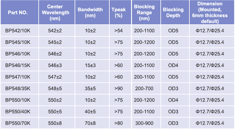 帶通濾光片波長(zhǎng)范圍:542nm-550nm