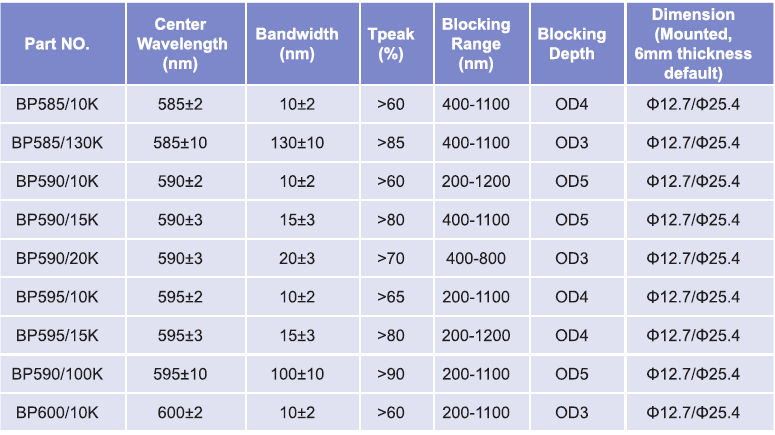 帶通濾光片波長(zhǎng)范圍:565nm-580nm