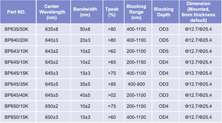 帶通濾光片波長范圍:630nm-635nm