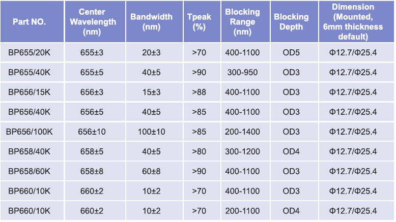 帶通濾光片波長范圍:655nm-660nm