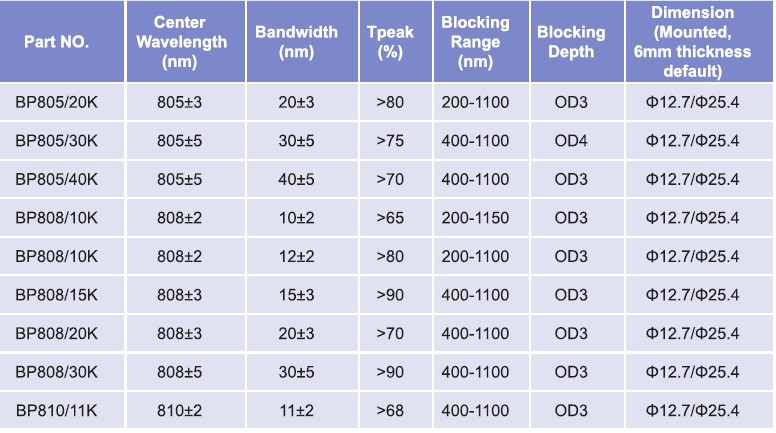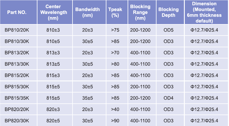 帶通濾光片波長范圍:800nm-810nm