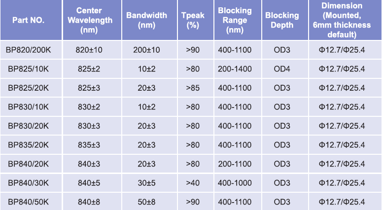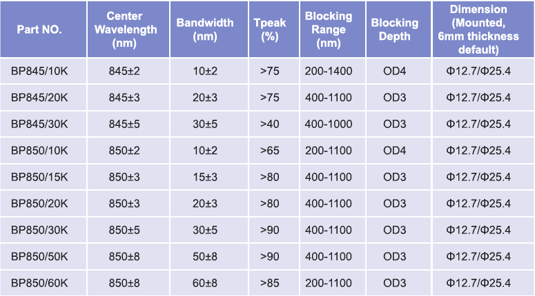 帶通濾光片波長范圍:845nm-850nm