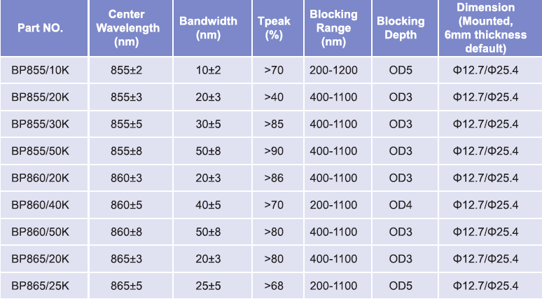 帶通濾光片波長范圍:855nm-865nm