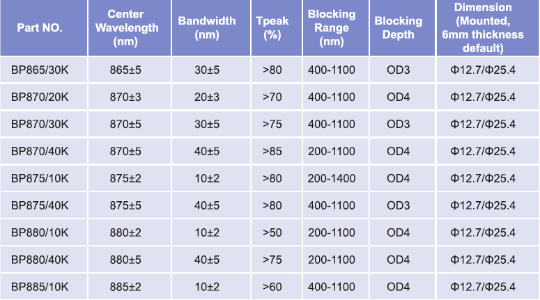 帶通濾光片波長范圍:865nm-885nm