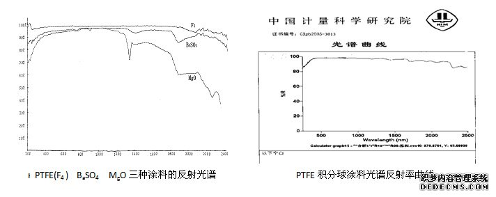 這是一種常用的積分球,用于測量各種樣品的反射率,透射率,在球體上前后兩半球相對位置上開有入光孔,樣品孔,在球體上適當(dāng)位置裝有接收器,并在接收親器與樣品孔之間設(shè)以擋板,以防樣品的一次反射光進入接收器。這種球的尺寸為 φ30-2500mm ,一般配有支架和底座。內(nèi)表面噴涂優(yōu)質(zhì)的PTFE涂料,反射率高,壽命長,表面整體性好。PTFE涂料的光譜曲線見圖示。
