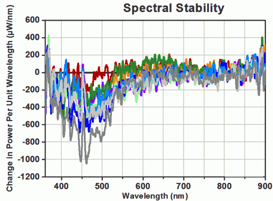 這些曲線(xiàn)是把光源啟動(dòng)后不同時(shí)間的光譜減去一個(gè)起始參考光譜的結(jié)果。不同顏色是不同的時(shí)間的光譜數(shù)據(jù)(0.2h-24h))
