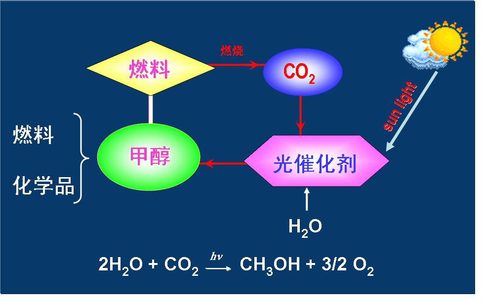 其一是經(jīng)太陽能化學(xué)和生物轉(zhuǎn)化分解水制氫,然后將氫與CO2經(jīng)傳統(tǒng)的光催化轉(zhuǎn)化為甲醇,和其他的化學(xué)品,即:H2O → H2 + 1/2O2,H2 + CO2 → CH3OH,凈反應(yīng):H2O + CO2 → CH3OH + O2↑。此過程的關(guān)鍵科學(xué)問題是:(1)開發(fā)高效光催化劑;(2)將光催化制取的氫從反應(yīng)體系中有效分離,并與CO2催化轉(zhuǎn)化耦合。