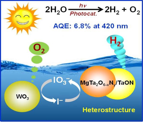 近日,中國(guó)科學(xué)院大連化學(xué)物理研究所催化基礎(chǔ)國(guó)家重點(diǎn)實(shí)驗(yàn)室及潔凈能源國(guó)家實(shí)驗(yàn)室太陽(yáng)能研究部研究員、中科院院士李燦和研究員章福祥、陳閃山等與日本東京大學(xué)教授Kazunari Domen課題組合作,在可見(jiàn)光驅(qū)動(dòng)光催化Z機(jī)制完全分解水制氫研究中取得進(jìn)展。研究結(jié)果發(fā)現(xiàn),經(jīng)一步氮化合成的MgTa2O6−xNy/TaON異質(zhì)結(jié)材料(長(zhǎng)可吸收波長(zhǎng)達(dá)570 nm)可有效促進(jìn)光生電荷分離,基于此異質(zhì)結(jié)材料構(gòu)筑的寬光譜響應(yīng)Z機(jī)制完全分解水制氫體系,其表觀量子效率達(dá)到目前文獻(xiàn)報(bào)道高值(AQE: 6.8%@420 nm)。相關(guān)結(jié)果在線發(fā)表在《德國(guó)應(yīng)用化學(xué)》期刊上。