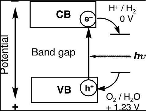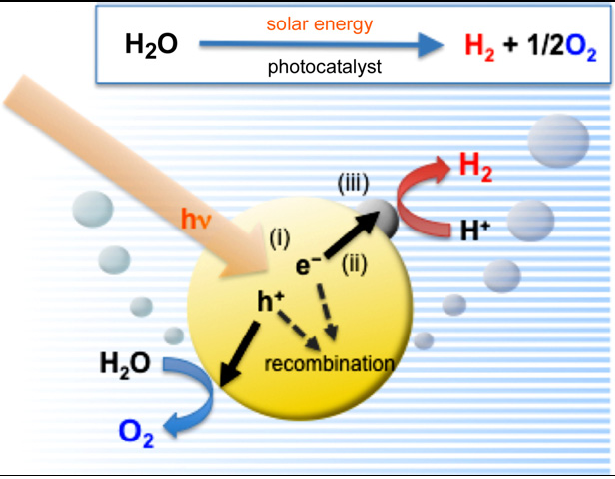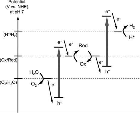 | 圖2.光分解水制氫原理示意圖[1] | 圖3.光分解水制氫的主要過(guò)程示意圖[2] |