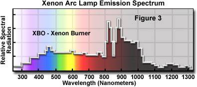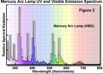 氙燈和汞燈做為白光源,都能提供從紫外到近紅外一系列波長的光,但它們卻有著不同的激發(fā)光譜。汞燈集中在近紫外、藍光以及綠光附近,這種在峰值的高激發(fā)能量確保產(chǎn)生明亮的熒光信號,但光毒性卻很強。因此,HBO用來對固定樣品或弱熒光成像。相比而言,氙燈光源的激發(fā)比較平緩,可以用于不同波長間強度的比較,例如用于鈣離子濃度測量等。氙燈的強激發(fā)在近紅外800-1000nm。