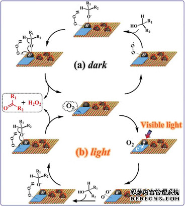 TiO2@NC-Ru-T中氮摻雜碳不僅增強了Ru納米顆粒的催化性能,同時通過Mott-Schottky接觸促進了光活化Ru納米顆粒中光生電子向TiO2的輸運。在可見光照射下,上述效應(yīng)可以大增強乙醇在空氣中的選擇性需氧氧化。這一研究為光催化反應(yīng)中提高可見光吸收和電荷/電子轉(zhuǎn)移提供了可行的方法,也為開發(fā)將太陽能轉(zhuǎn)化為相關(guān)化學品的能源轉(zhuǎn)換反應(yīng)催化劑指明了新的方向。