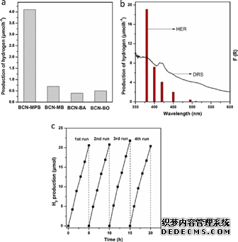 其中,BCN-MPB為納米片,這與其他三種產(chǎn)物不同(BCN-MB、BCN-BA、BCN-BO)。與塊體BCN相比,BCN-MPB具有更大的比表面積、更長的光生載流子壽命和更強的電子輸運能力。因此,其在可見光輻射下具有增強的光催化產(chǎn)氫性能。