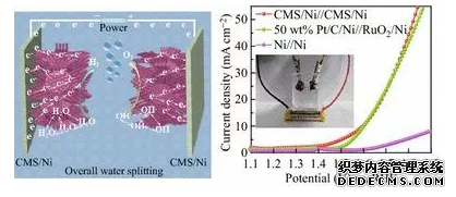 測(cè)試結(jié)果表明,CMS/Ni電在堿性介質(zhì)中對(duì)析氫反應(yīng)和析氧反應(yīng)表現(xiàn)出很好的性能,與純Co9S8/Ni和MnS/Ni相比具有明顯的優(yōu)勢(shì)。更重要的是,這種多功能的CMS/Ni可以在1.47V的電位下催化雙電系統(tǒng)中的水分解,并且該電解槽可以由1.50 V商用干電池有效驅(qū)動(dòng)。