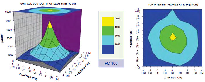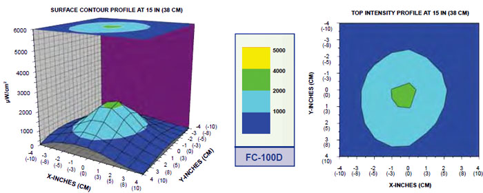 • 超高強(qiáng)度 15”距離(38cm),標(biāo)準(zhǔn)型號FC-100紫外強(qiáng)度達(dá)5000µW/cm² ,配散光濾色片的FC-100D紫外強(qiáng)度達(dá)2200µW/cm²。