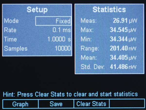 能夠進(jìn)行脈沖峰間測(cè)量,在樣本速率為250 kHz 時(shí),重復(fù)頻率高達(dá)4 kHz。脈沖、峰間和DC 光源測(cè)量可以W、dBm、dBJ、AV Sun 等為單位進(jìn)行顯示,取決于使用的探測(cè)器類型。